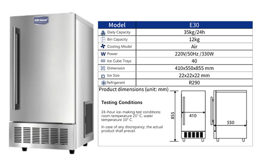 Key Specs: 35 kg/day output, compact 410x550x855 mm footprint.